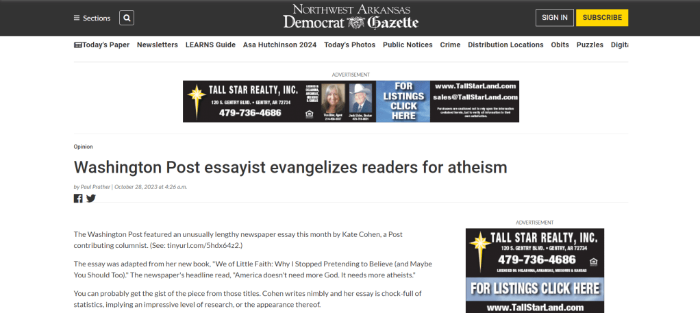 يعلق الكاتب على مقال للكاتبة كيت كوهين في صحيفة واشنطن بوست، وهو مقتبس من كتابها الجديد، “نحن قليلو الإيمان: لماذا توقفت عن التظاهر بالإيمان (وربما ينبغي عليك أن تفعل ذلك أيضًا)”. وقد جاء في عنوان الصحيفة: “أمريكا لا تحتاج إلى المزيد من الإله. إنها بحاجة إلى المزيد من الملحدين”.